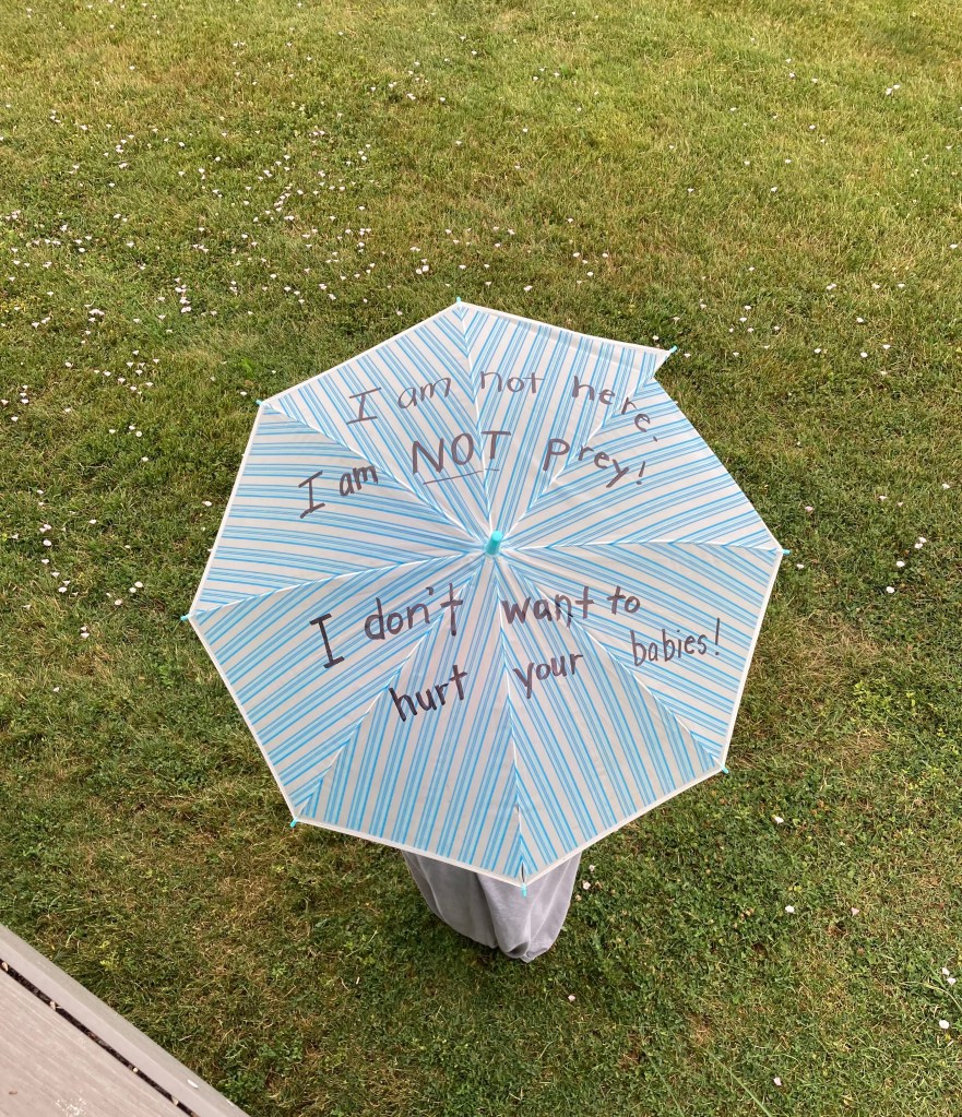Someday, perhaps I will grow up and take peaceful walks without a thought of bird attacks. But for now, if you see me walking with an umbrella on sunny days in July, you will know that I am “being ware” of the small but mighty red-winged blackbirds.