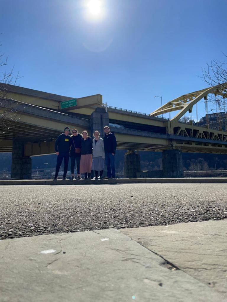 I would show you a picture of Ricky, Jasmine, me, Kayleen, and Carlin beside a yellow Pittsburgh arch bridge on a beautiful sunny day in Point State Park.