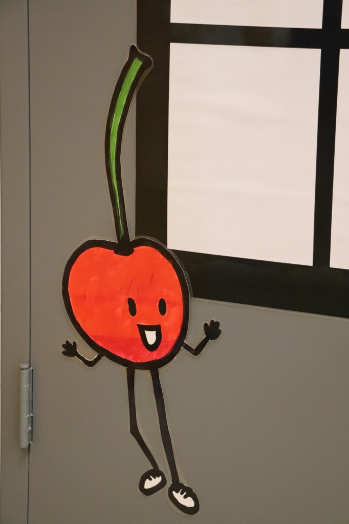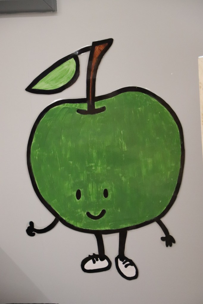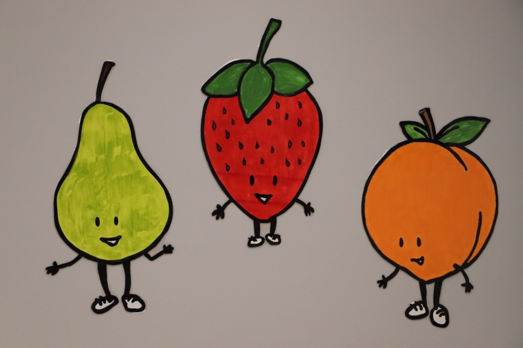I projected Ricky’s drawings to trace large fruits for the walls. Holly spent significant time learning new printing/cutting modes on her machine and then helped me cut out all the small fruits.