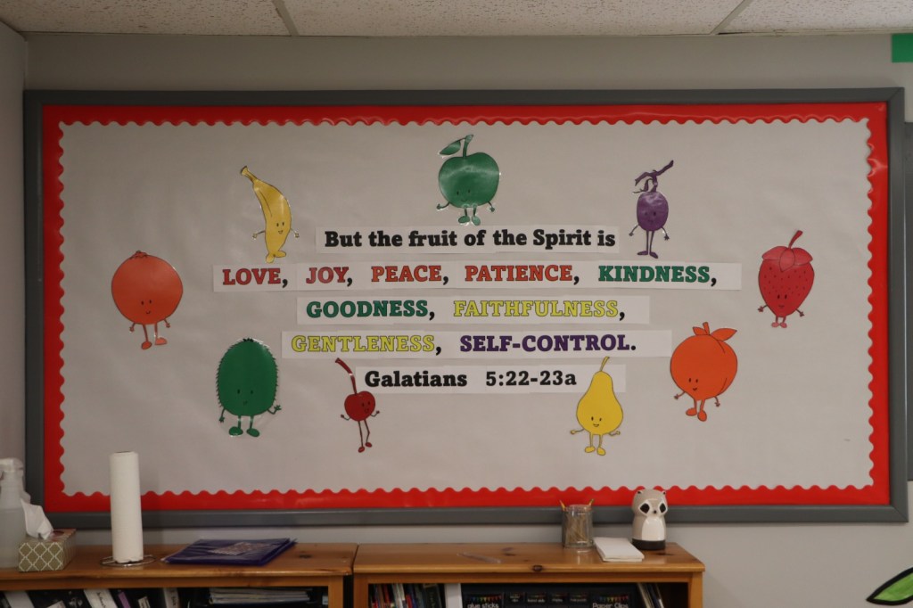 When I asked Kayleen for ideas, she immediately started giving brilliant suggestions, the second of which was this already well-developed “Fruits of the Spirit” theme. I’m a little suspicious that she spent hours lying awake preparing the perfect idea in case I asked this question, but she claims it came to her on the spot. I do believe her. (Somehow, I don’t think having 8-month-old twins gives one a lot of spare time to brainstorm ideas for their sister’s classroom.)