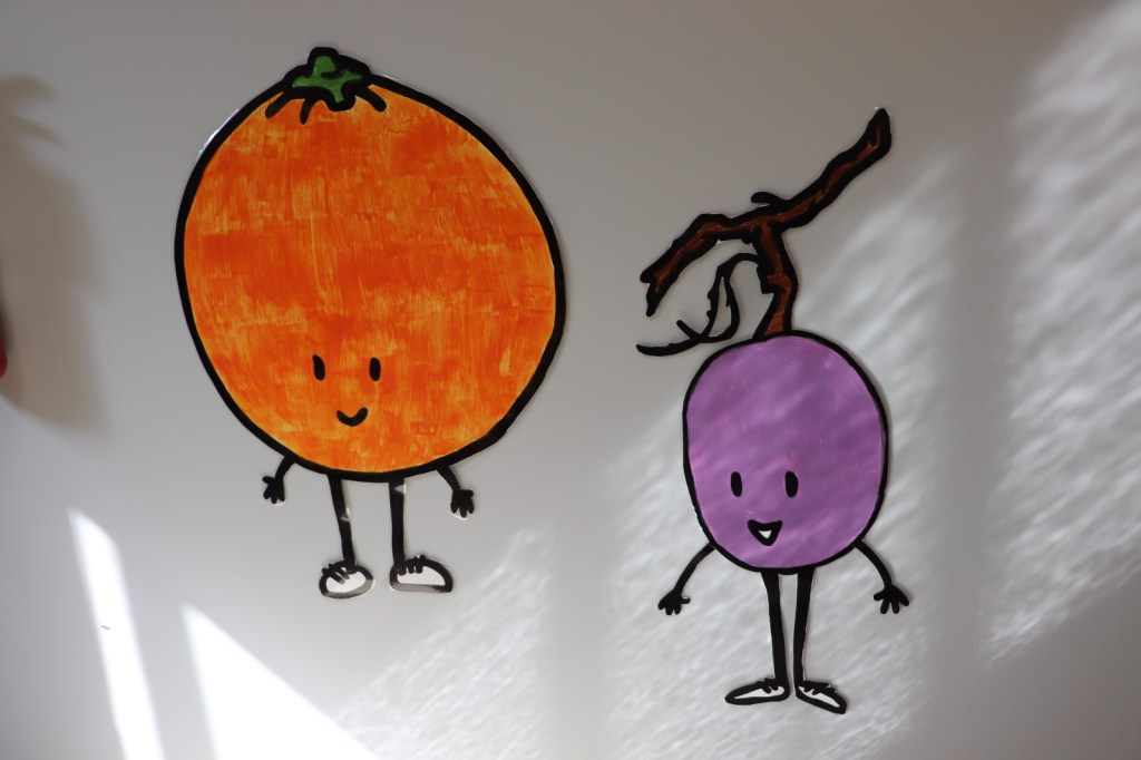 Ricky agreed to this “fun little project” when I asked him if he wanted to draw fruit characters for me. His drawings never disappoint, and soon I had nine of the cutest fruit characters complete with tennis shoes.